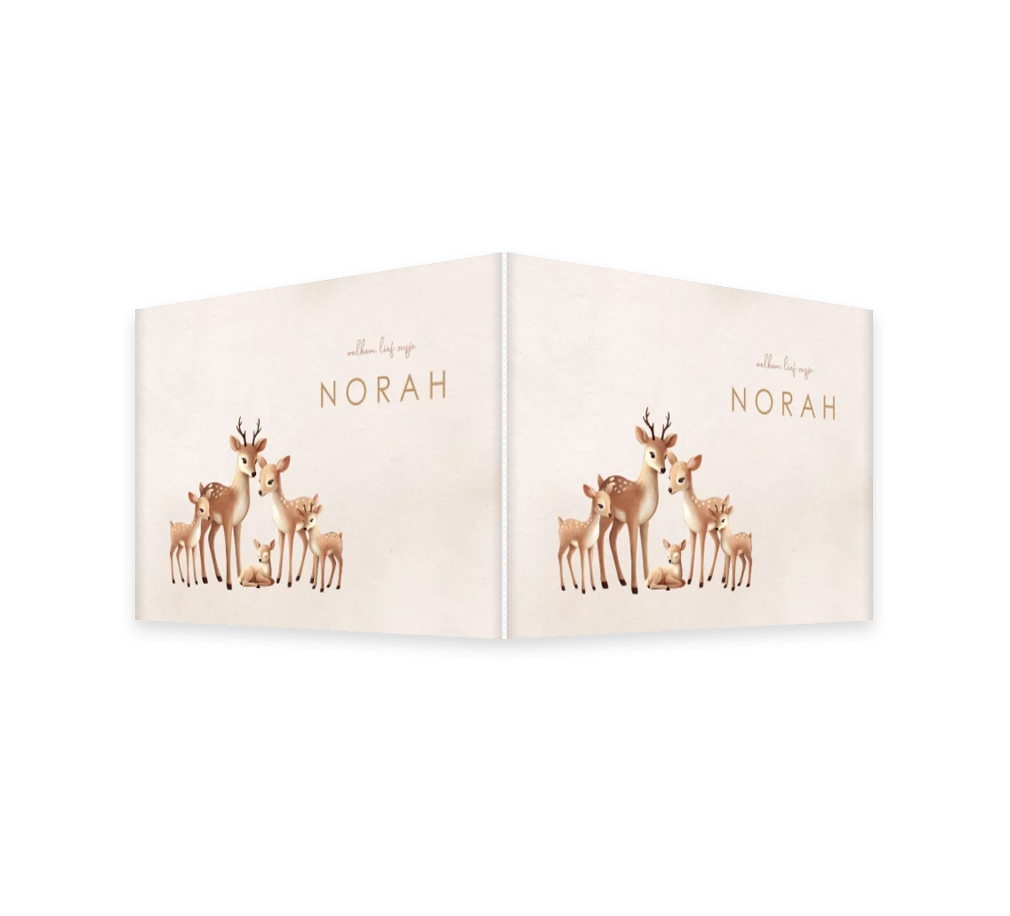 Kondig de geboorte van jullie kindje aan met dit mooie geboortebord. De beigetinten zorgen voor een rustgevende uitstraling, en het hertengezinnetje laat ook de broertjes en zusjes stralen.