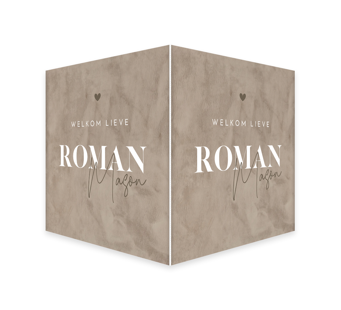 Laat iedereen weten dat jullie zoontje is geboren met dit strakke dubbele raambord in beige velvet-look! In het midden de tekst in hippe typografie met een klein bruin hartje erboven. Het makelaarsbord kan gemakkelijk bewerkt worden in onze online editor. Je maakt één zijde op in de editor en dit wordt vervolgens op twee zijdes gedrukt.
