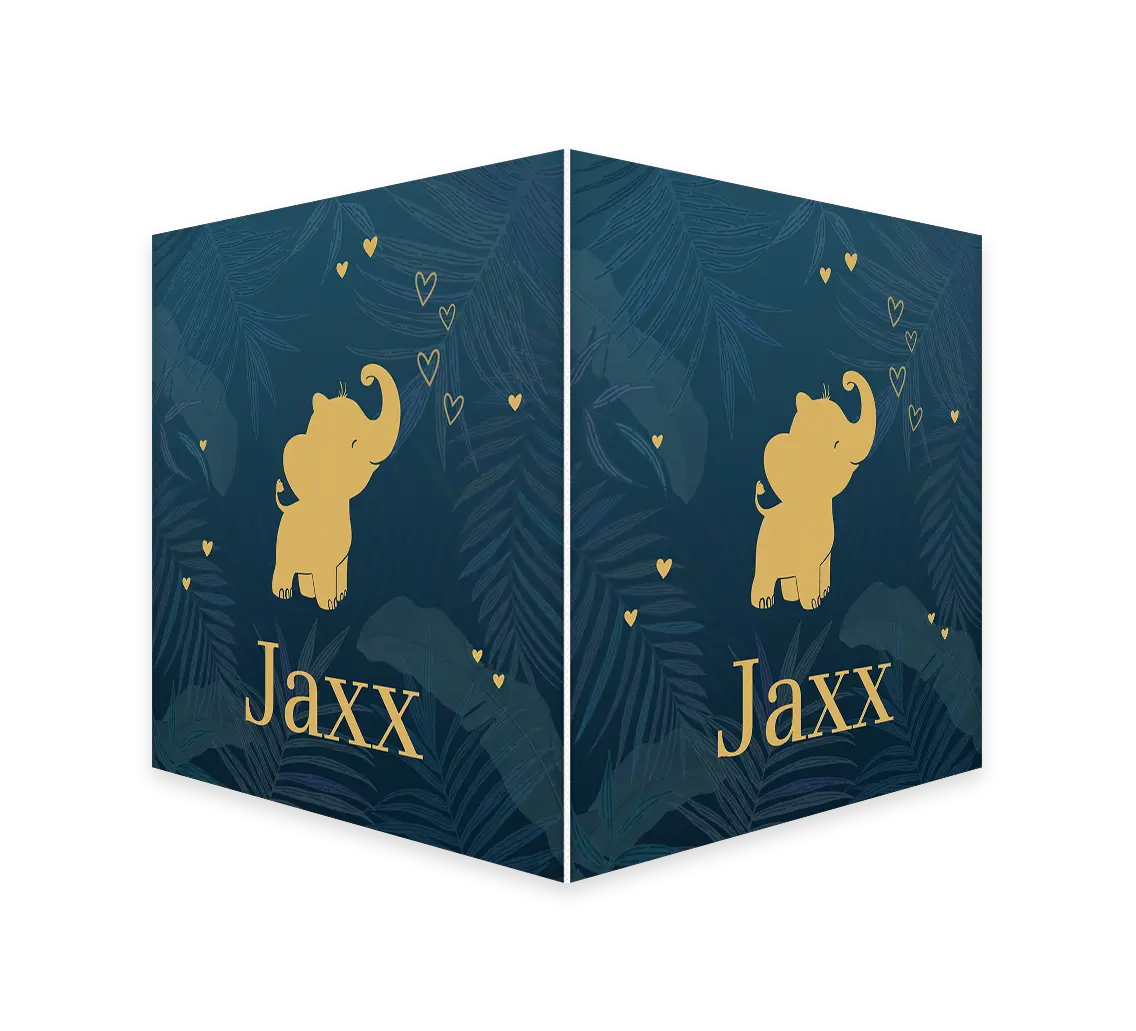 Schattig raambord met een achtergrond van een blauw junglepatroon en hartjes. Boven de naam een vrolijk olifantje in goudfolie. Het makelaarsbord kan gemakkelijk bewerkt worden in onze online editor. Je maakt één zijde op in de editor en dit wordt vervolgens op twee zijdes gedrukt.