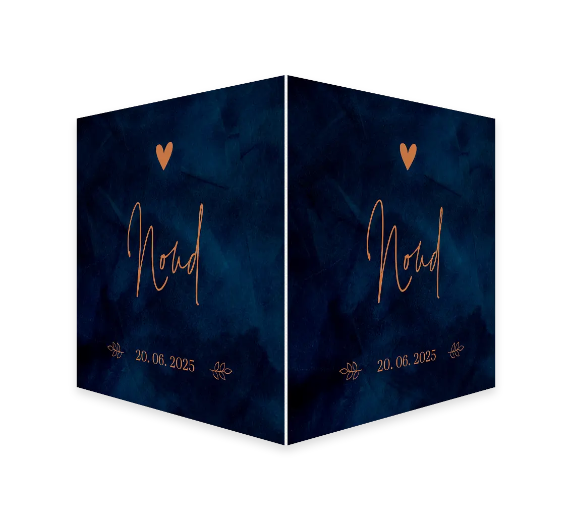 Jullie zoontje is geboren, laat het iedereen weten met dit stoere dubbele raambord in donkerblauwe velvetlook! De naam staat in hippe letters met daarboven een klein hartje, beide in koperkleur. Het makelaarsbord kan gemakkelijk bewerkt worden in onze online editor. Je maakt één zijde op in de editor en dit wordt vervolgens op twee zijdes gedrukt.