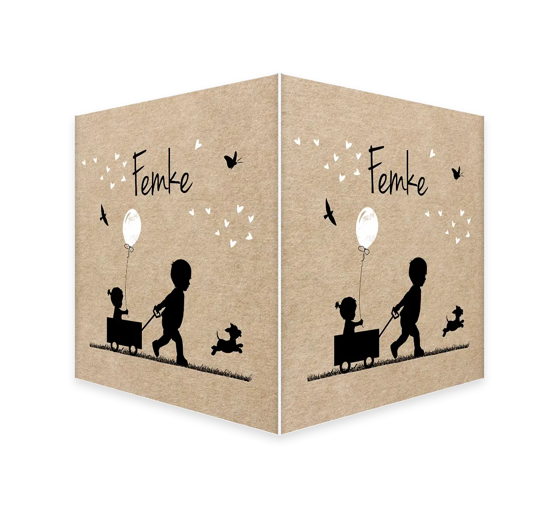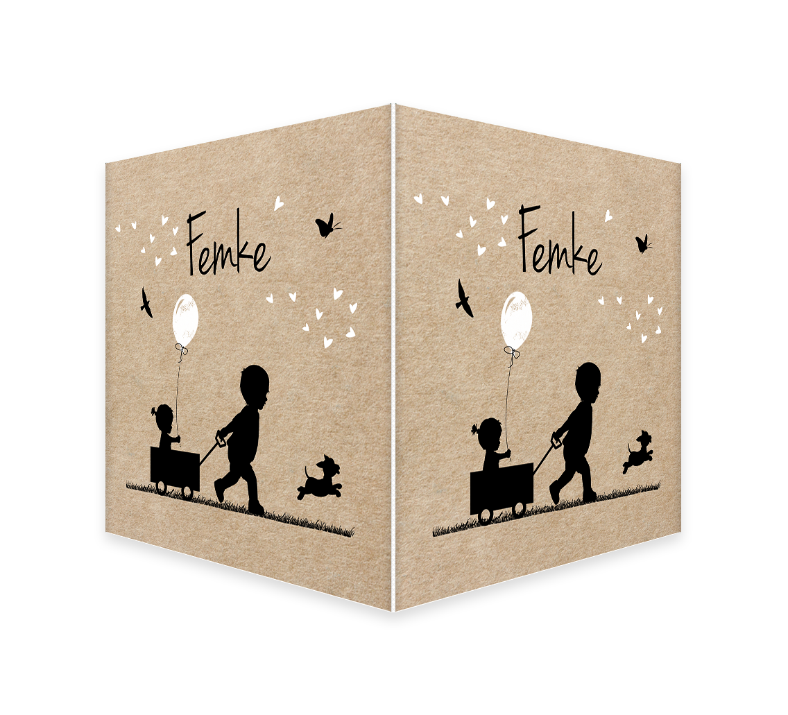 Stoer en schattig tegelijk, dit vrolijke tafereel op dit dubbele raambord. Een jongetje trekt het karretje met zijn kleine zusje, het meisje houdt een witte ballon vast, erboven een wolk van witte hartjes, een vlinder en een vogel. Het kleine hondje rent blij vooraan. Het makelaarsbord kan gemakkelijk bewerkt worden in onze online editor. Je maakt één zijde op in de editor en dit wordt vervolgens op twee zijdes gedrukt.