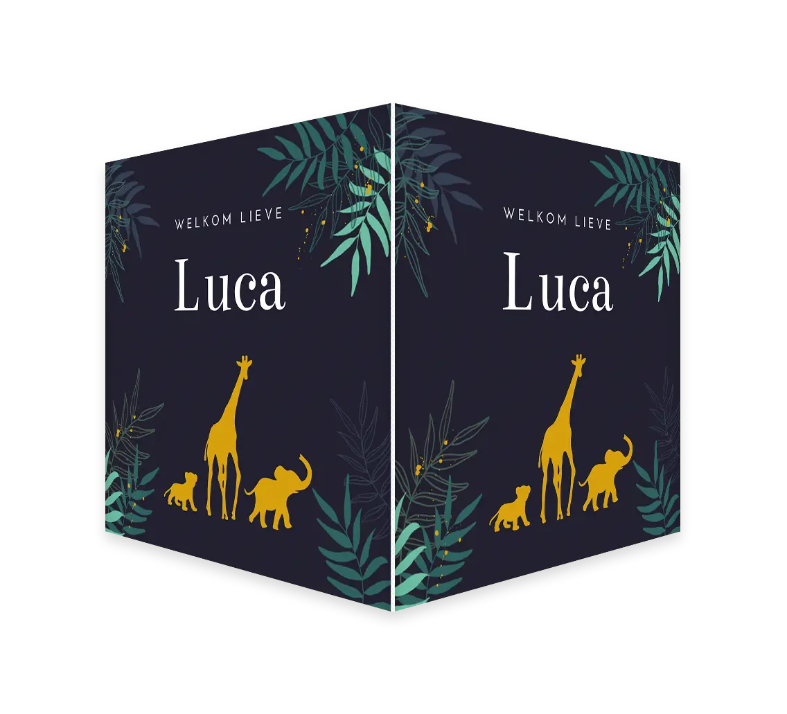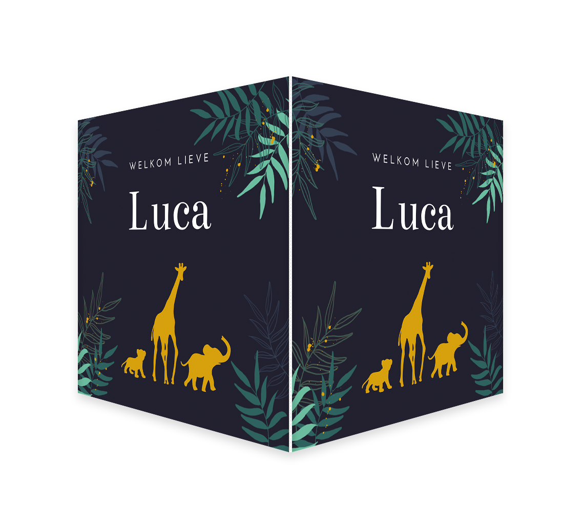 Stoer dubbel raambord met een optocht van een olifant, giraffe en een leeuwenwelpje. Langs de rand staan groene takjes. De naam staat in hippe typografie in wit, deze pas je zelf eenvoudig aan in de editor. Het makelaarsbord kan gemakkelijk bewerkt worden in onze online editor. Je maakt één zijde op in de editor en dit wordt vervolgens op twee zijdes gedrukt.