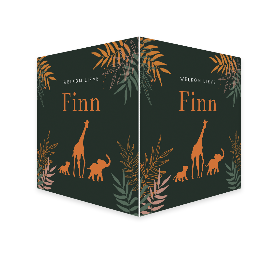 Laat iedereen weten dat jullie zoontje is geboren met dit stoere raambord in junglestijl. Op het donkergroene bord staan de silhouetten van leeuw, olifantje en giraffe in oranje, net als de naam in trendy letters. De bladeren langs de rand maken het helemaal af. Het makelaarsbord kan gemakkelijk bewerkt worden in onze online editor. Je maakt één zijde op in de editor en dit wordt vervolgens op twee zijdes gedrukt.