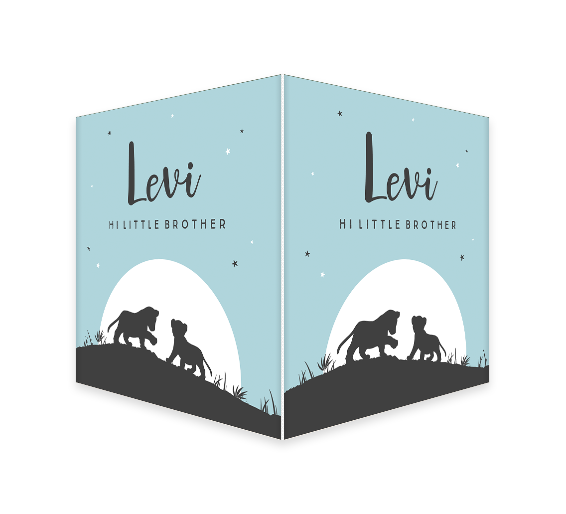 Laat iedereen weten dat er een broertje is geboren met dit coole dubbele raambord! Op de blauwe achtergrond met witte maan en sterren zie je het zwarte silhouet van spelende welpen op een heuvel. Het makelaarsbord kan gemakkelijk bewerkt worden in onze online editor. Je maakt één zijde op in de editor en dit wordt vervolgens op twee zijdes gedrukt.