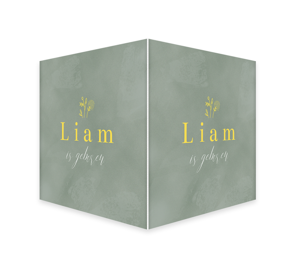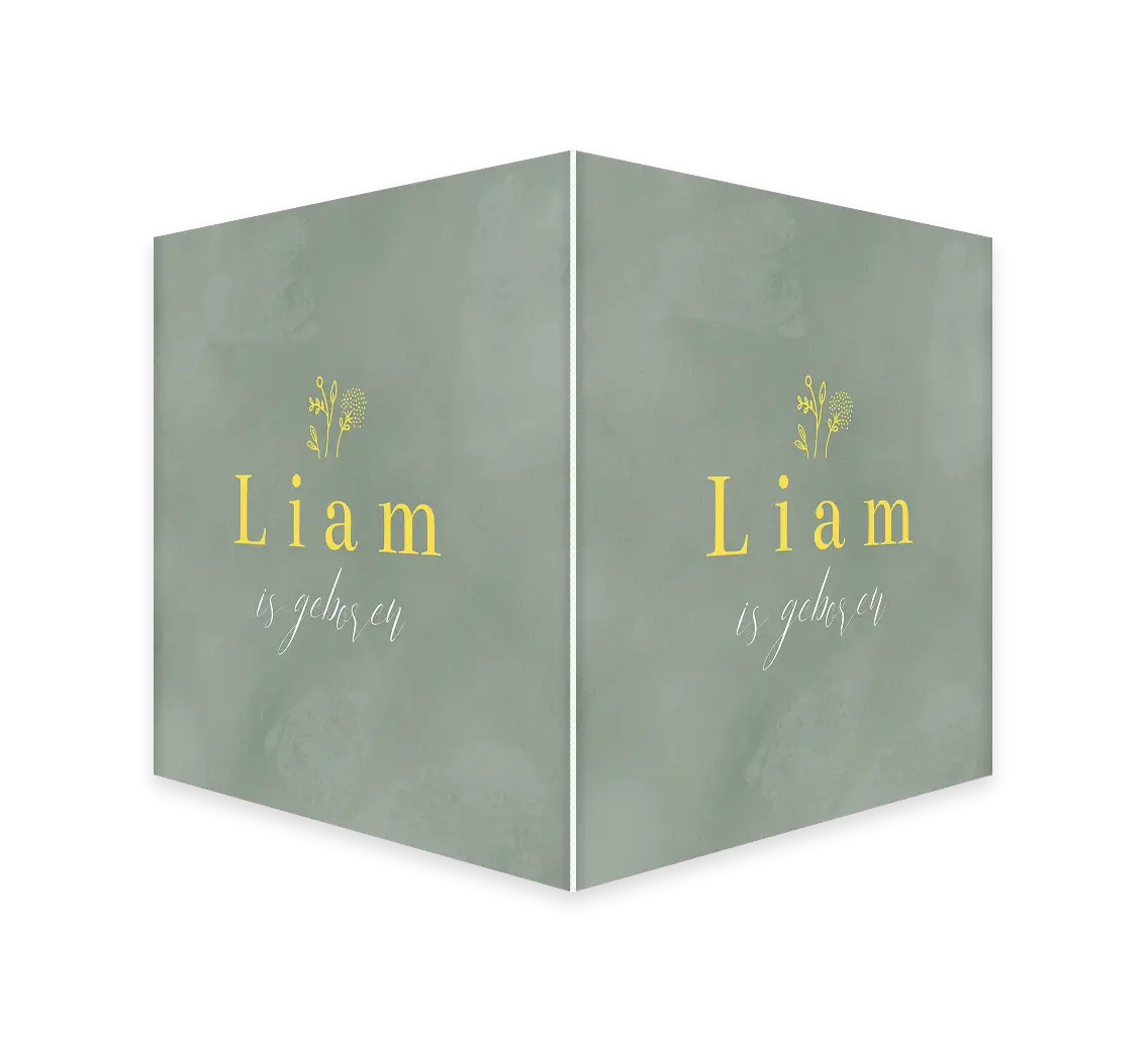 Minimalistisch dubbel raambord om iedereen te laten weten dat jullie kindje is geboren! De naam staat in goudgeel met getekende takjes erboven op een achtergrond van groene velvet-look. Het makelaarsbord kan gemakkelijk bewerkt worden in onze online editor. Je maakt één zijde op in de editor en dit wordt vervolgens op twee zijdes gedrukt.