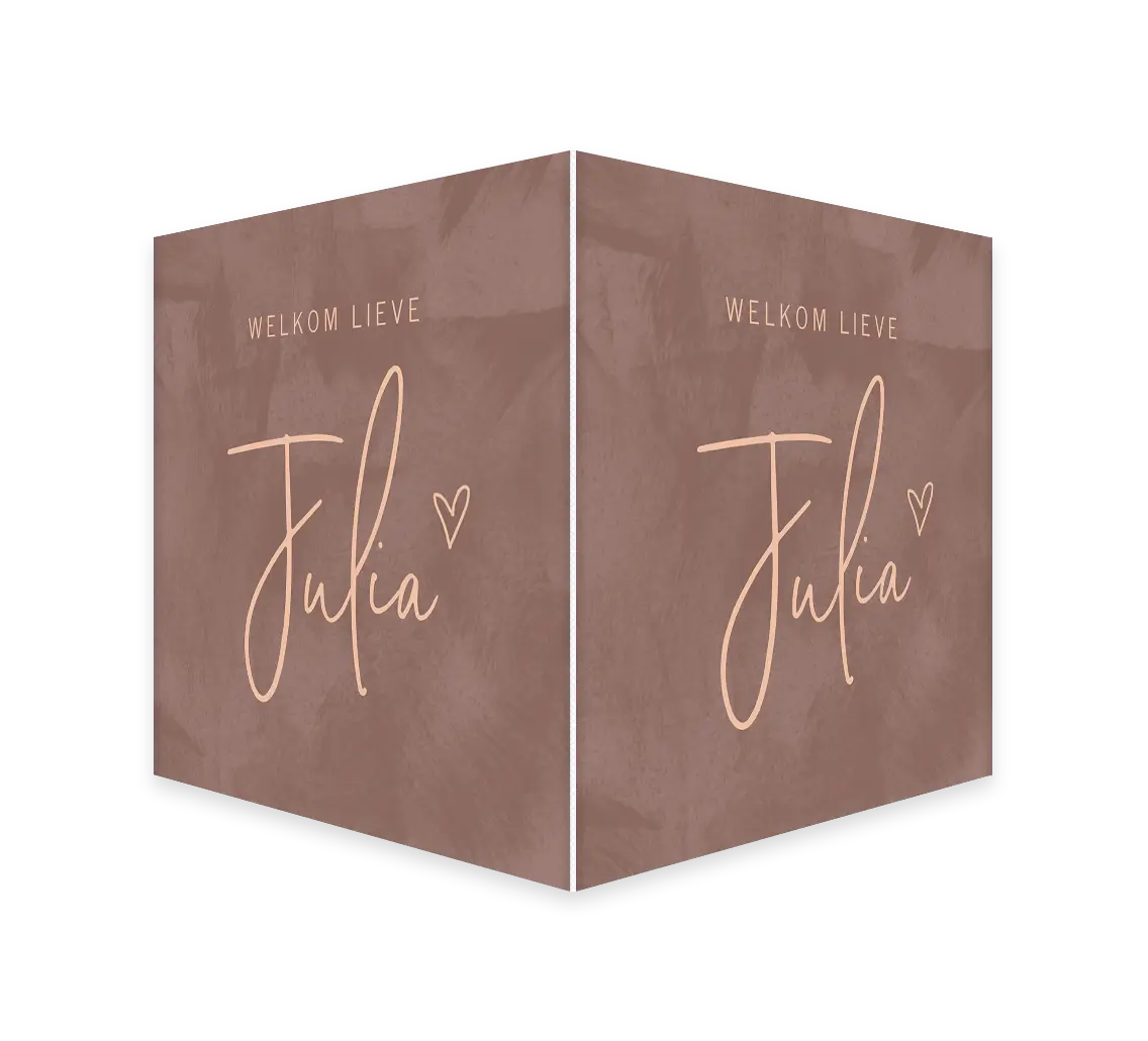 Trendy dubbel raambord om iedereen te laten weten dat jullie dochter is geboren. De naam staat in pastelkleur op een donkerroze fluweellook. Het kleine hartje maakt het helemaal compleet, lief! Het makelaarsbord kan gemakkelijk bewerkt worden in onze online editor. Je maakt één zijde op in de editor en dit wordt vervolgens op twee zijdes gedrukt.