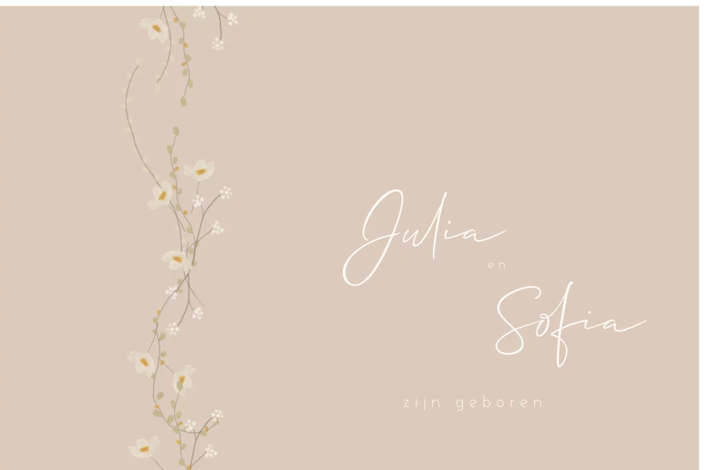 Laat iedereen weten dat jullie meisjes zijn geboren met dit schattige geboortebord in soft pastelkleur met een bloemenslinger. Pas de namen eenvoudig zelf aan in de online editor.