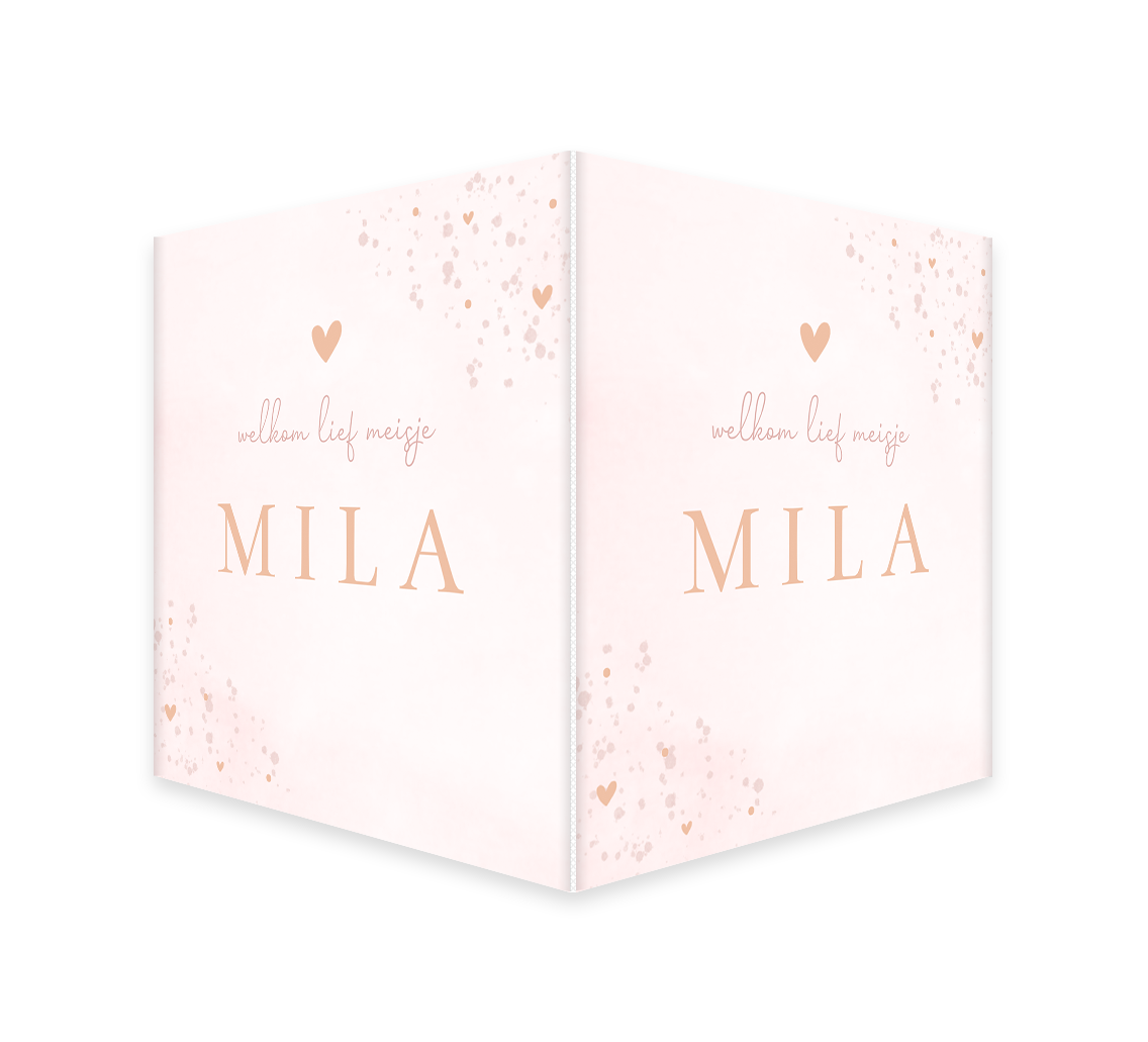 Het kan niet missen, met dit raambord weet iedereen dat er een meisje is geboren! Op dit zachtroze aquarel dubbele raambord staat de naam in strakke roze letters centraal; lieve hartjes en kleine spetters in roze maken het compleet. Het makelaarsbord kan gemakkelijk bewerkt worden in onze online editor. Je maakt één zijde op in de editor en dit wordt vervolgens op twee zijdes gedrukt.