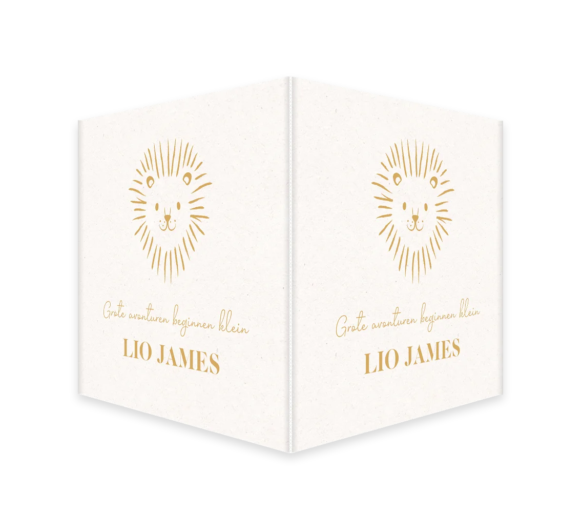 Lief raambord met een goudkleurig getekend leeuwtje om de geboorte van jullie kleintje aan te kondigen. Je maakt één zijde op in de editor en dit wordt vervolgens op twee zijdes gedrukt.