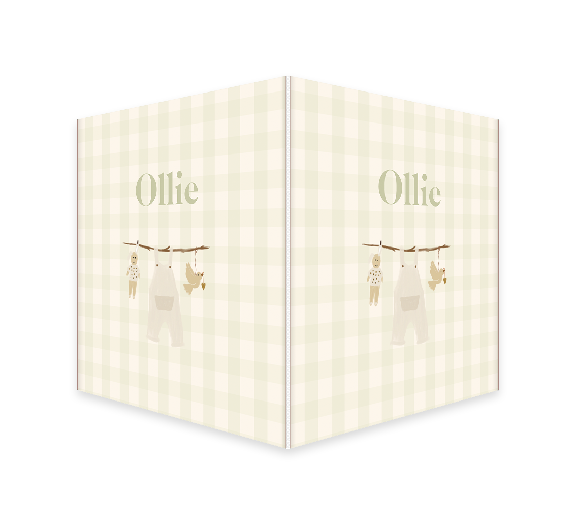 Een lief en vrolijk raambord voor jouw kindje. Het bord heeft een lichtgroen ruitjespatroon als achtergrond. Op de voorgrond zie je een lieve illustratie van een waslijn met kleertjes en knuffels. Daarboven is ruimte voor de naam van het kindje.