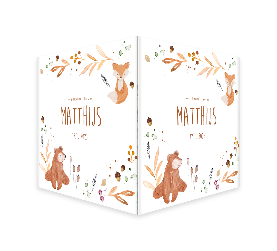 Kondig de geboorte van jullie kleintje aan met dit sfeervolle raambord. De getekende beer en vos worden omringd door takjes, spetters en eikels. De sticker is naar wens aan te passen in onze online opmaaktool.