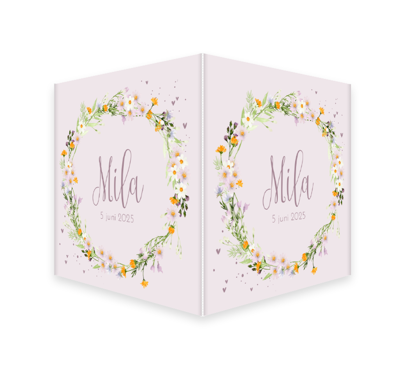 Een romantisch raambord om de geboorte van jouw kindje straks aan te kondigen. Het bord heeft een vierkant formaat met daarop een lieve bloemenkrans. De achtergrond heeft een lila kleur. Pas het raambord naar wens aan in onze online editor.