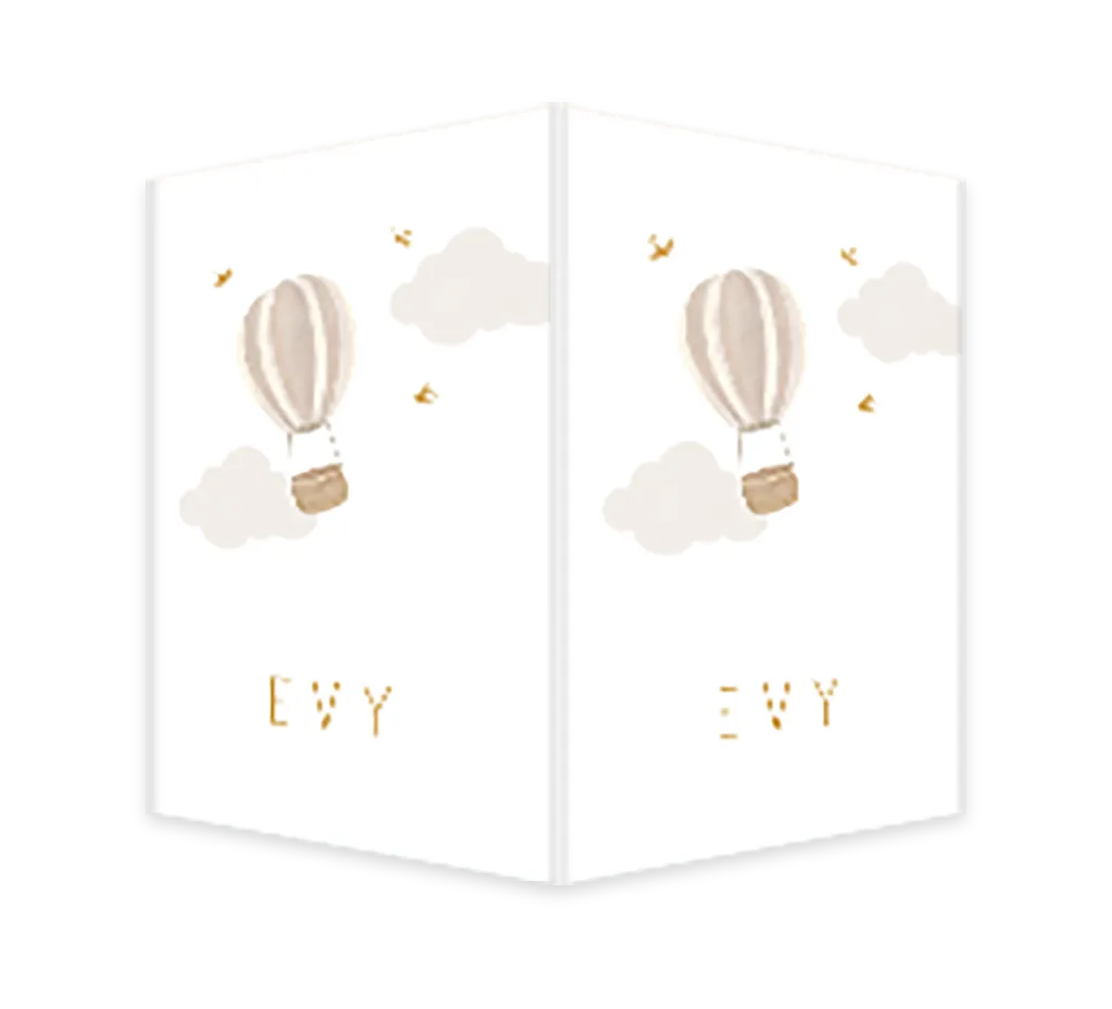 Een stijlvol raambord voor jouw kindje. Het raambord heeft een witte achtergrond met een luchtballon en kleine vogeltjes tussen de wolken. Pas het ontwerp naar wens aan in de editor.