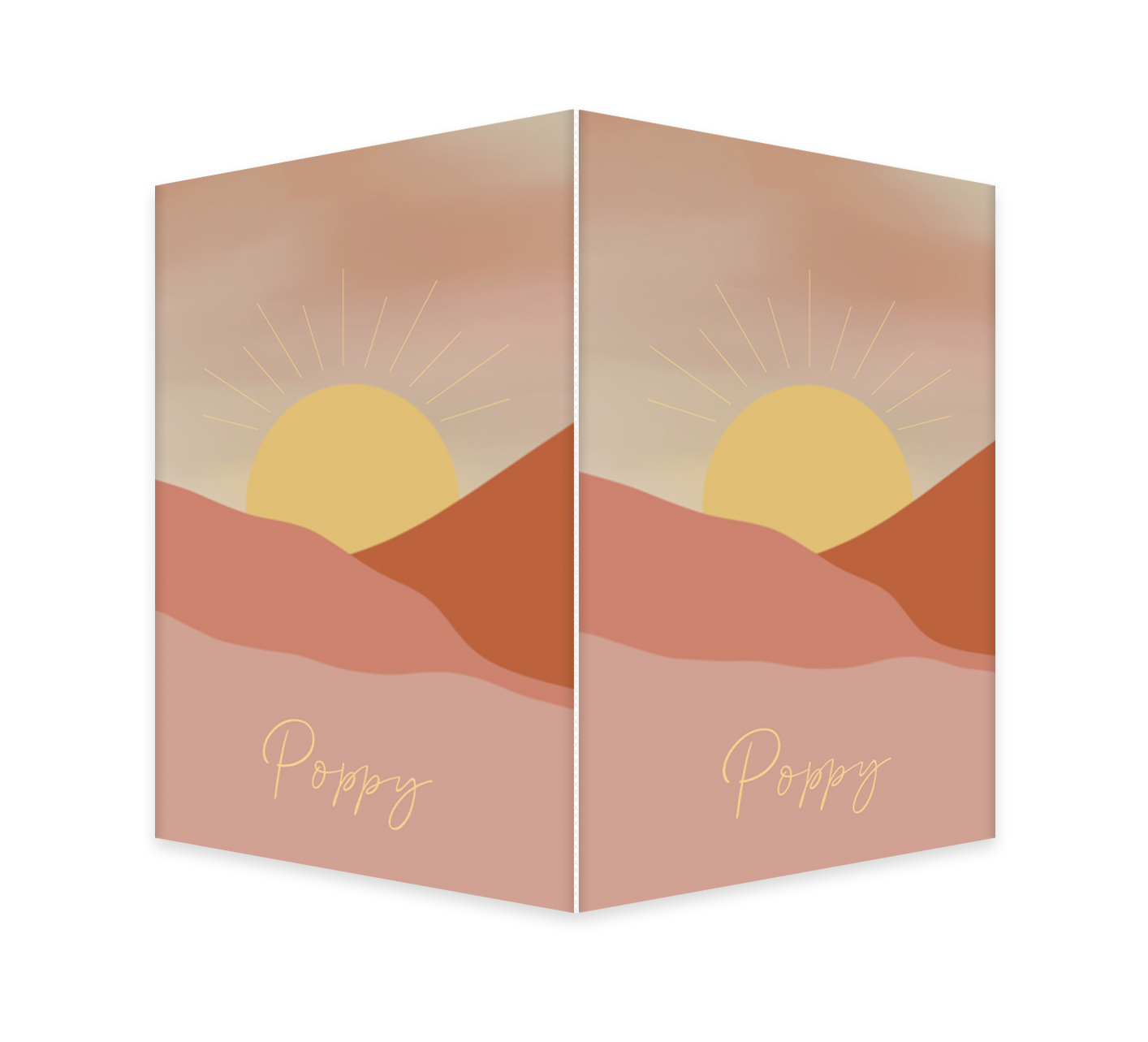 Een stijlvol raambord meisje met berglandschap en zon. Het bord heeft prachtige roze en aardetinten. Pas het ontwerp naar wens aan in onze editor.
