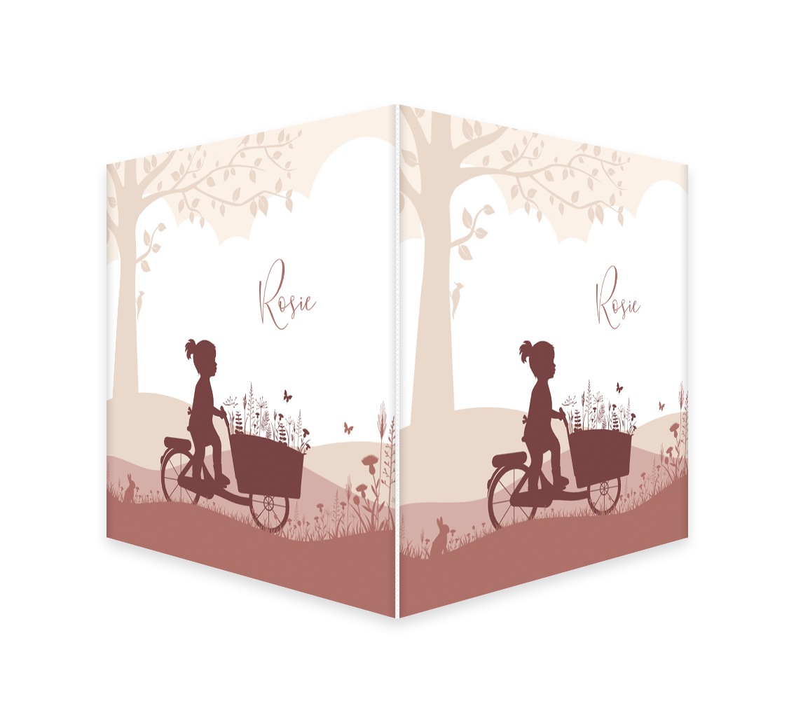 Kondig de geboorte van jullie kindje aan met een eigen ontworpen raambord! Op het raambord staat het silhouet van een meisje op een bakfiets, de bloemetjes maken het bord extra vrolijk. Je maakt één zijde op in de editor en dit wordt vervolgens op twee zijdes gedrukt.
