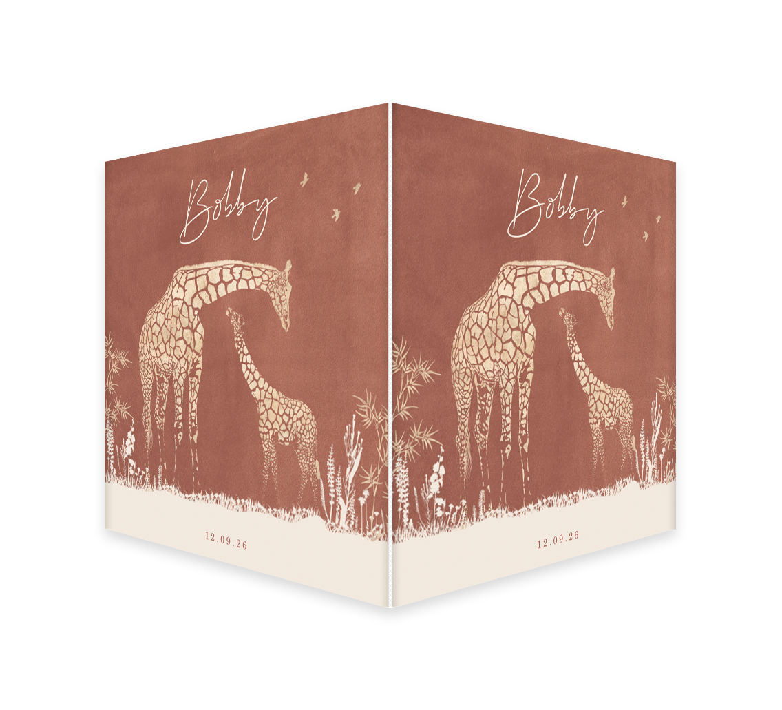 Een stoer en hip raambord voor jouw kindje. Het bord heeft een vierkant formaat met daarop een roestkleur achtergrond. Je ziet twee giraffen tussen de bladeren. Pas het ontwerp naar wens zelf aan.