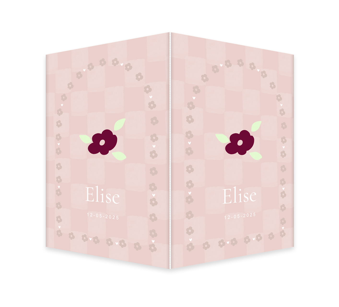 Een tof raambord om de geboorte van jullie meisje aan te kondigen. Het bord heeft een roze achtergrond met daarop een ruitjespatroon. In het midden zie je een bloemetje en een archboog van bloemetjes. Pas het ontwerp naar wens aan in onze online editor.