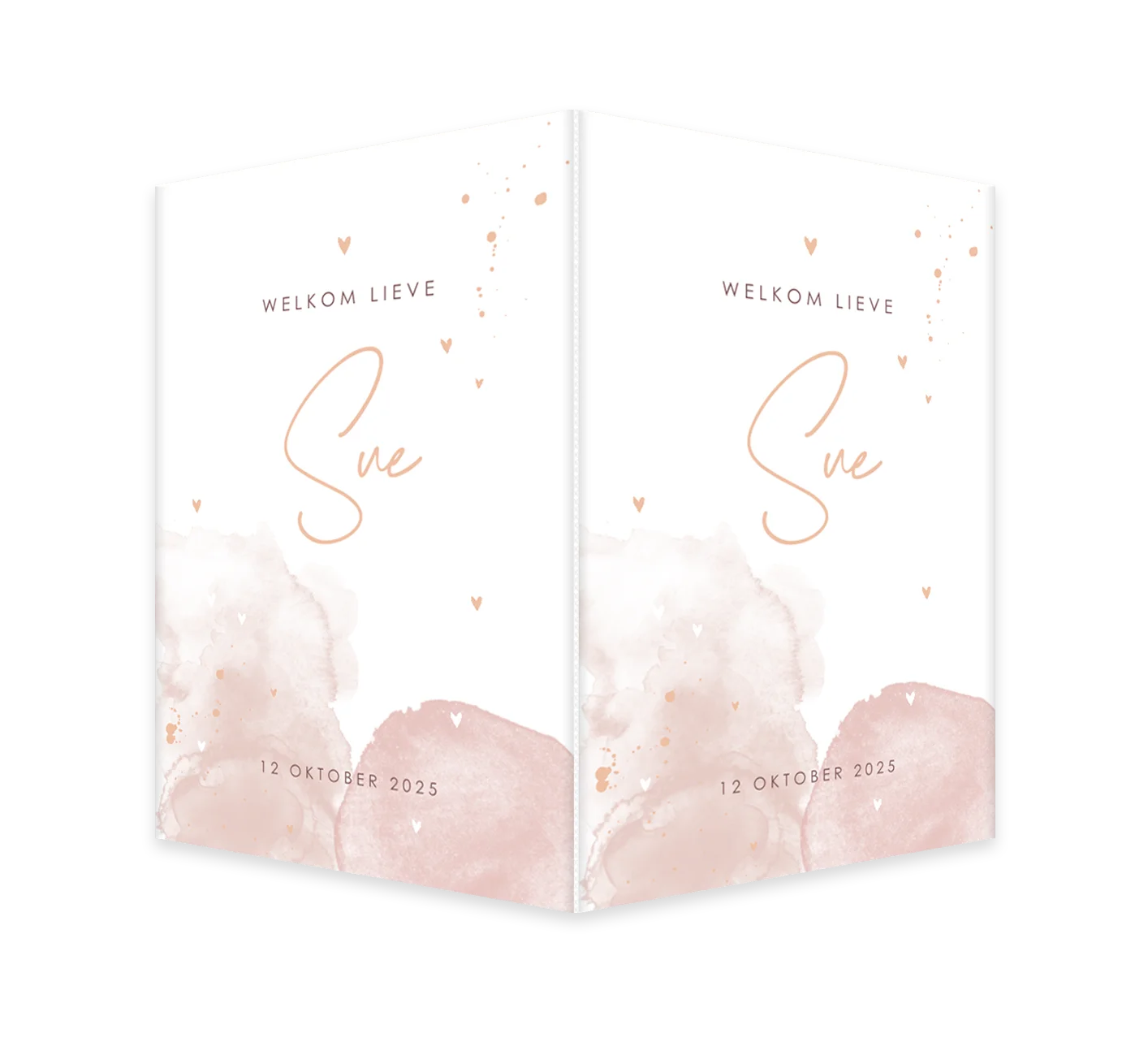 Een lief en romantisch raambord om de geboorte van jouw meisje aan te kondigen. Het bord heeft een roze watercolour en spetters. Pas het ontwerp naar wens aan in onze online editor.