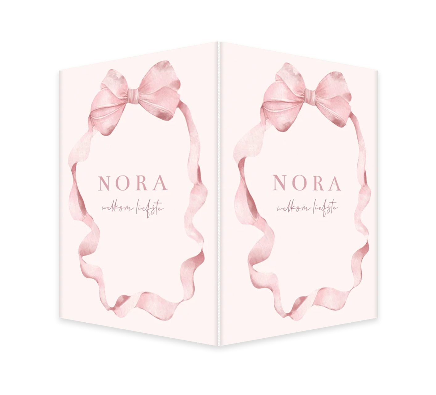 Een klassiek raambord passend bij het geboortekaartje. Het bord heeft een lichtroze achtergrond met daarop een lieve illustratie van een strik. Pas het ontwerp naar wens aan in onze online editor.
