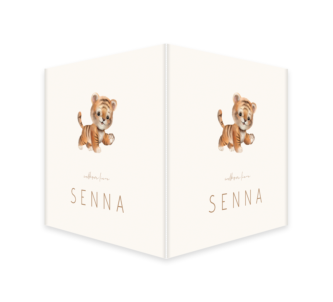 Kondig de geboorte van jullie kindje aan met dit lieve raambord! Op dit geboortebord staat een illustratie van een baby tijgertje. De achtergrond heeft een lichte creme kleur. Je maakt één zijde op in de editor en dit wordt vervolgens op twee zijdes gedrukt.
