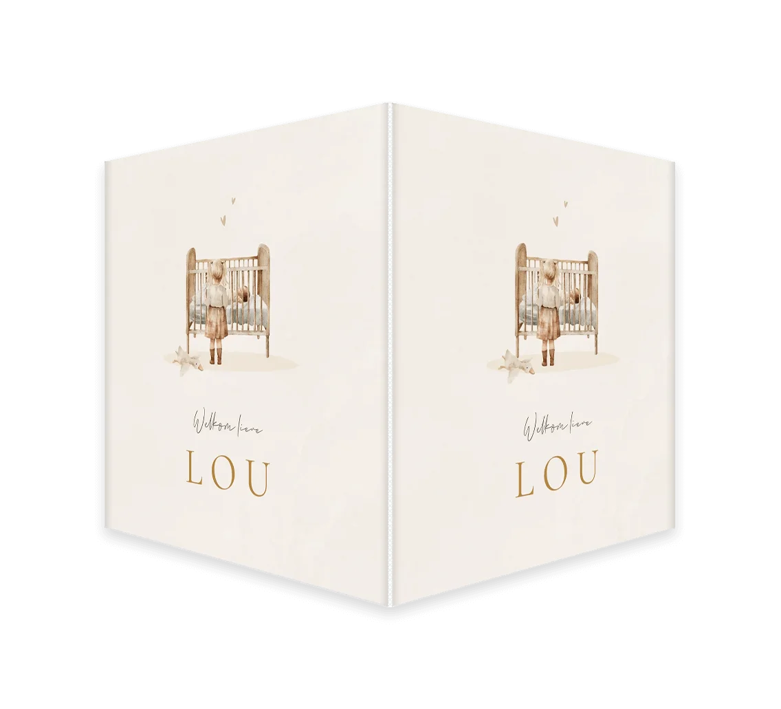 Een tof raambord om de geboorte van het kindje aan te kondigen. Het bord heeft beige tinten en een illustratie van een grote zus bij het wiegje van haar broertje of zusje.