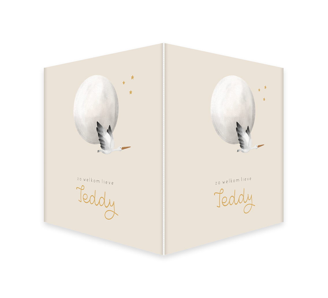Laat iedereen weten dat jullie kleintje is geboren met dit hippe beige raambord met een maantje in waterverf. Voor de maan vliegt een ooievaar. Het makelaarsbord kan gemakkelijk bewerkt worden in onze online editor. Je maakt één zijde op in de editor en dit wordt vervolgens op twee zijdes gedrukt.