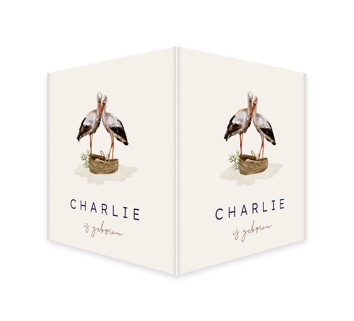 Een tof raambord om de geboorte van jouw kindje aan te kondigen. Het bord heeft een vierkant formaat met beige achtergrond. Daarnaast zie je twee ooievaars naast een mandje. Pas het ontwerp naar wens zelf aan.
