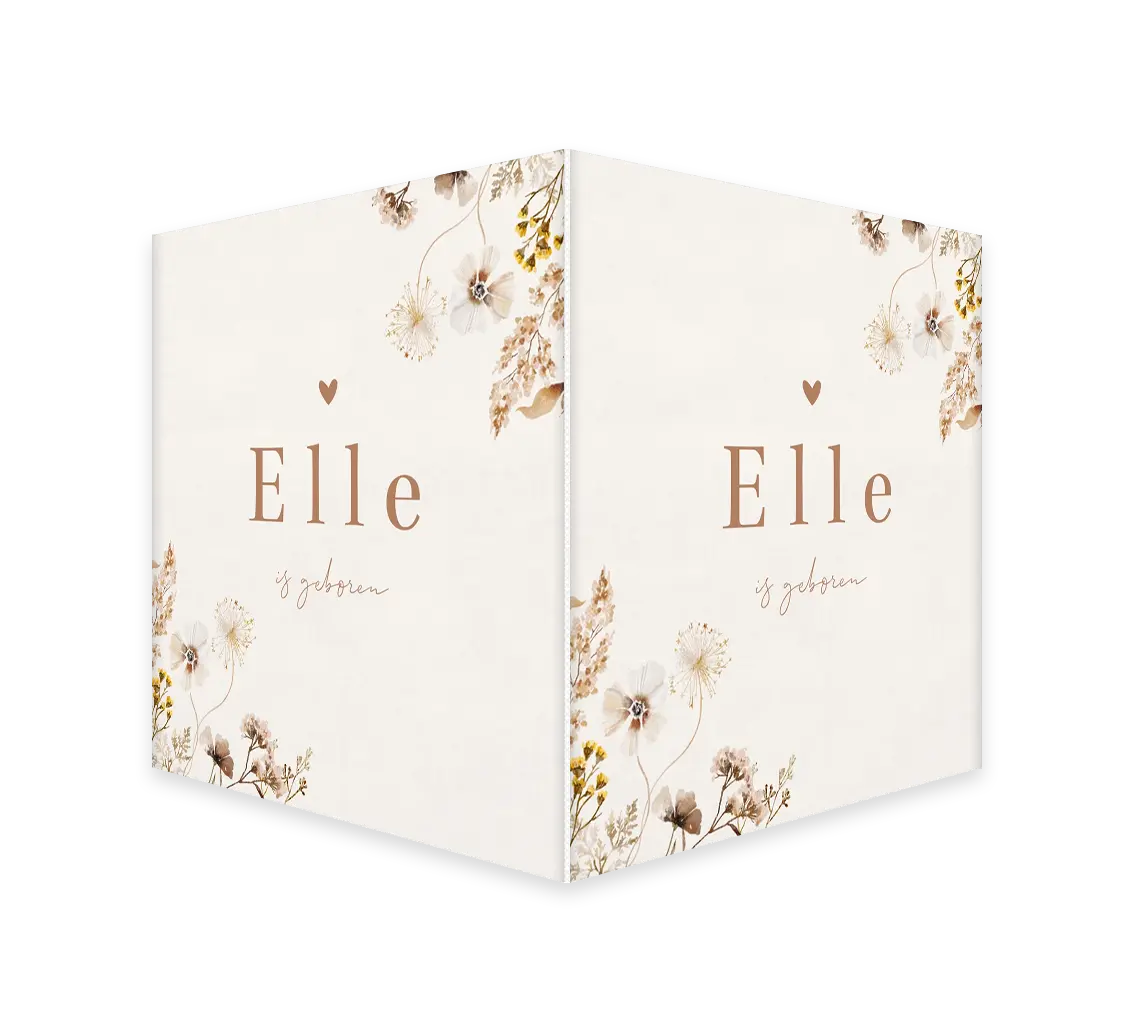 Een vierkant raambord om de geboorte aan te kondigen. Het bord heeft een beige achtergrond met veldbloemen. Pas het ontwerp naar wens aan in onze online editor.