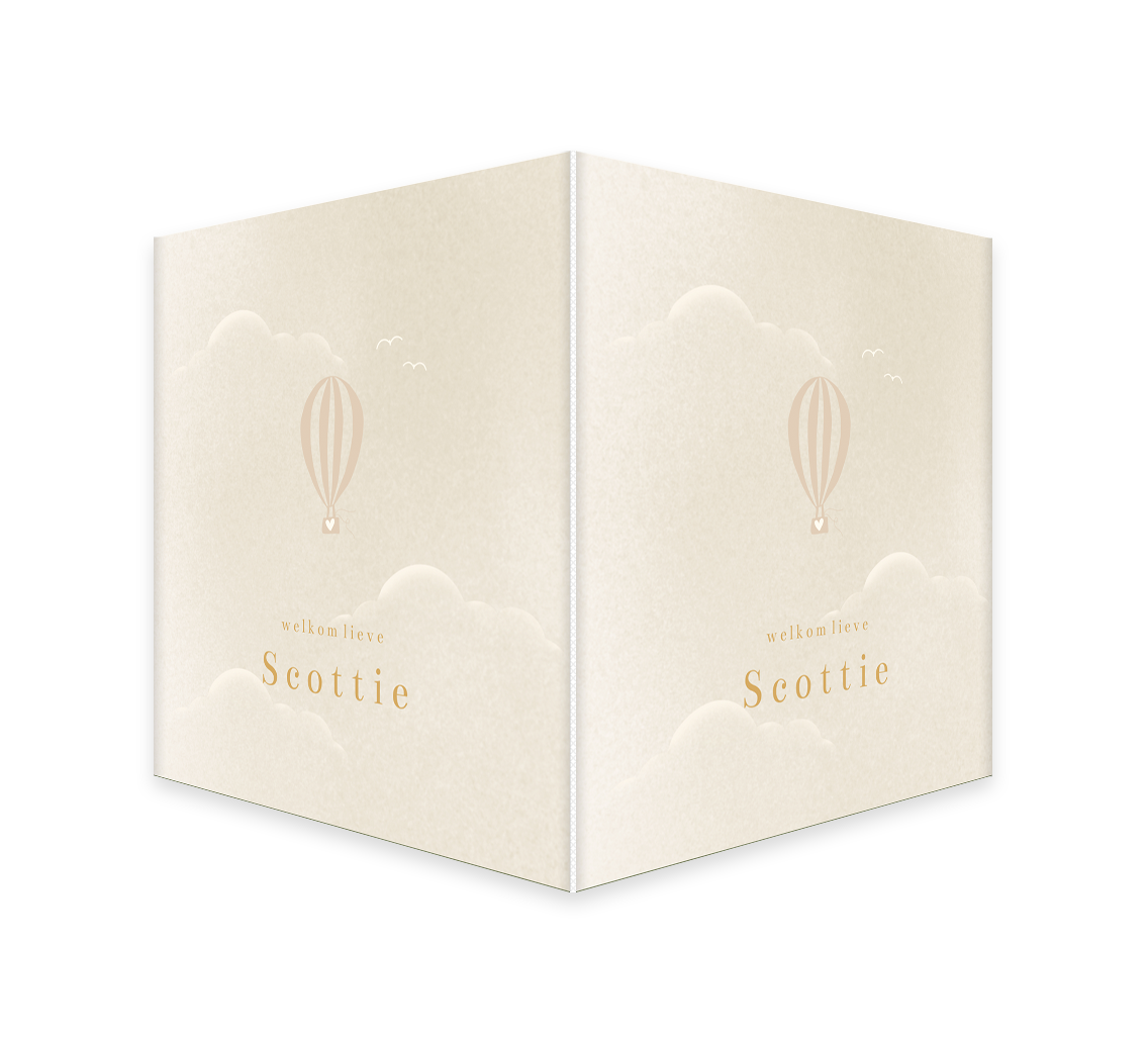 Een romantisch raambord voor de geboorte van jullie kindje. Het vierkante bord heeft een beige achtergrond met wolkjes en een luchtballon.