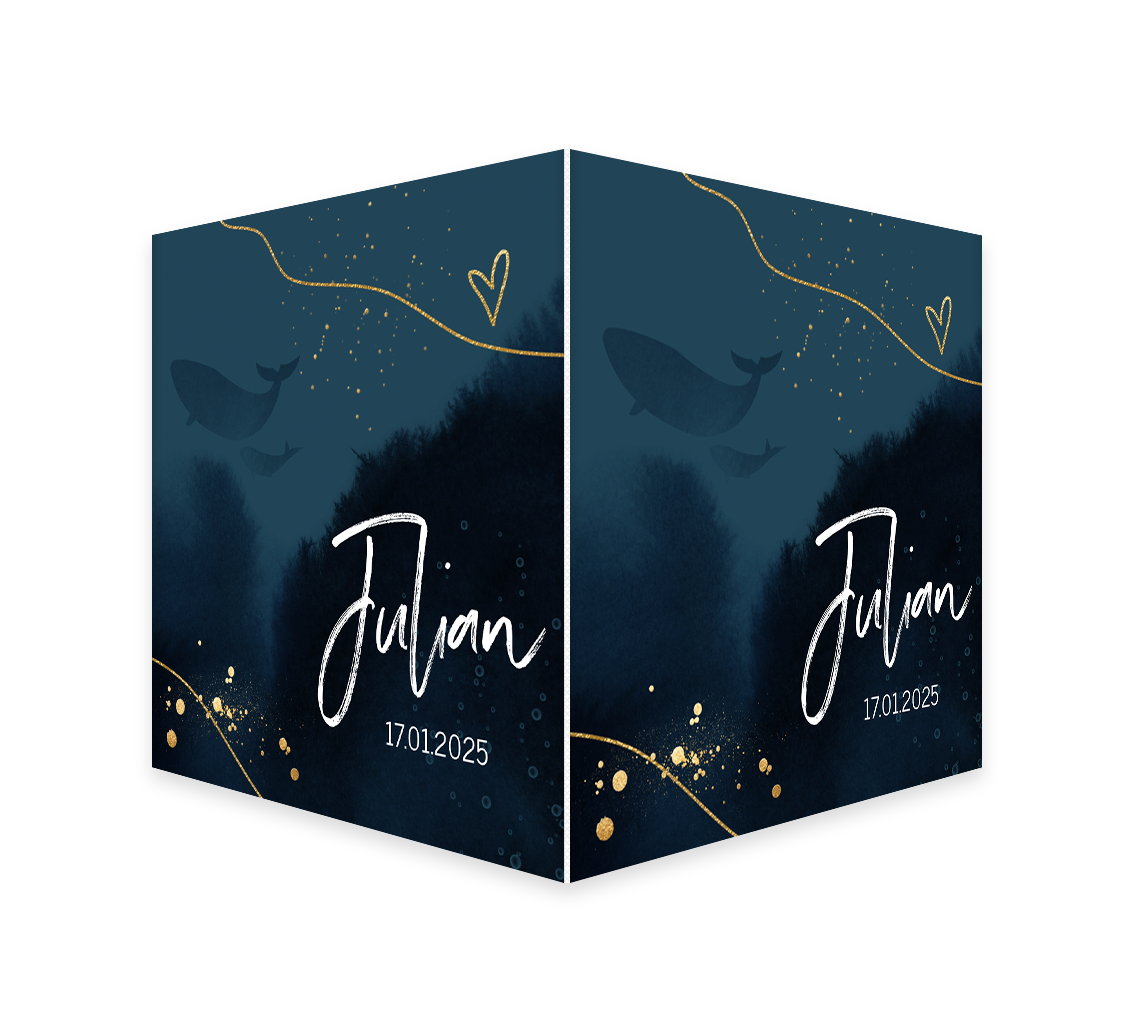 Trendy geboortebord om de geboorte van je zoon aan te kondigen. Het bord heeft een donkerblauwe basis met daarop goudlook details zoals een hartje en verf spetters. Ook zie je twee walvissen. Pas het ontwerp naar wens aan in onze online editor.