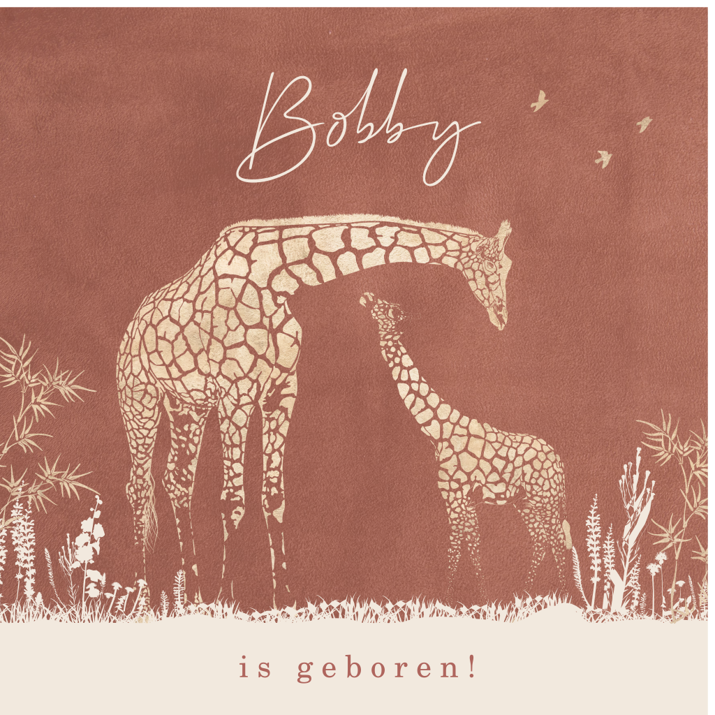 Een stijlvol raambord voor jouw kindje. Het bord heeft een roestkleur achtergrond met daarop twee giraffen. Pas het bord naar wens aan in onze online editor.