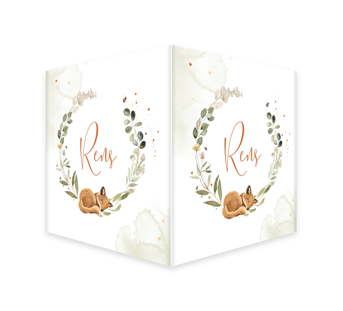 Schattig raambord om iedereen te laten weten dat jullie kleintje is geboren. Dit dubbele bord heeft een groene watercolour achtergrond met daarop een krans van bladeren waar een lief vosje ligt te slapen. Het makelaarsbord kan gemakkelijk bewerkt worden in onze online editor. Je maakt één zijde op in de editor en dit wordt vervolgens op twee zijdes gedrukt.
