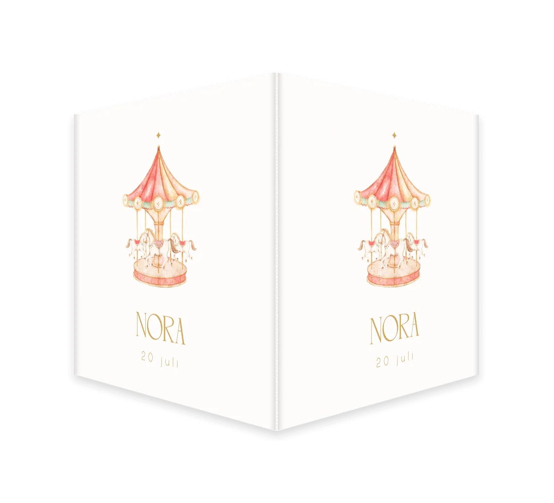 Een raambord passend bij het geboortekaartje. Het bord heeft een illustratie van een carrousel met paardjes. Het raambord heeft zachte roze en rode tinten. Pas het ontwerp naar wens aan in onze online editor.