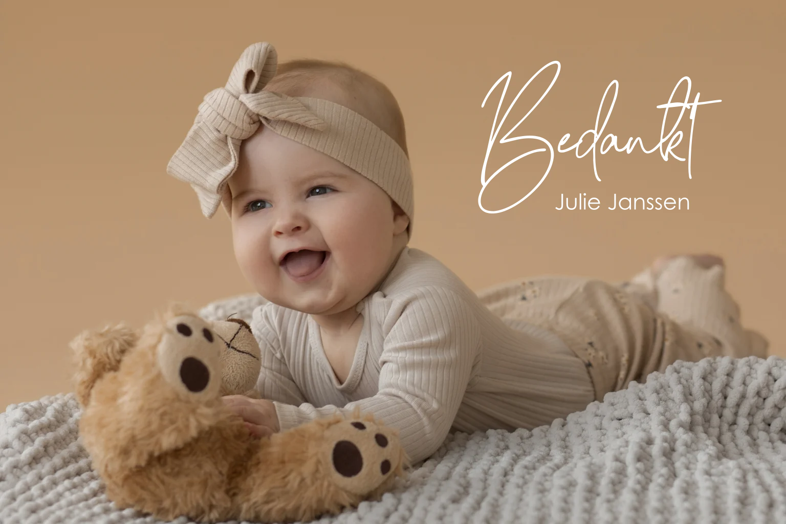 Een minimalistische bedankkaart voor jullie kindje. Een foto staat centraal en trekt meteen de aandacht. De tekst "Bedankt" wordt in goudfolie gedrukt. De ronde hoeken geven aan deze kaart een zachte uitstraling.