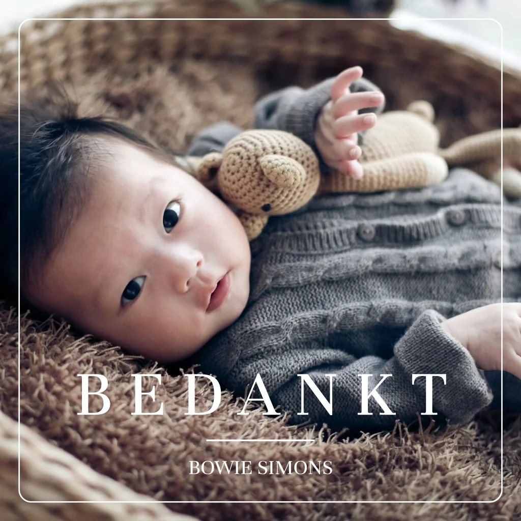 Een minimalistisch ontwerp voor de bedankkaart van jullie zoon of dochter. Centraal staat de foto van jullie kleintje met een subtiel wit kader er omheen.