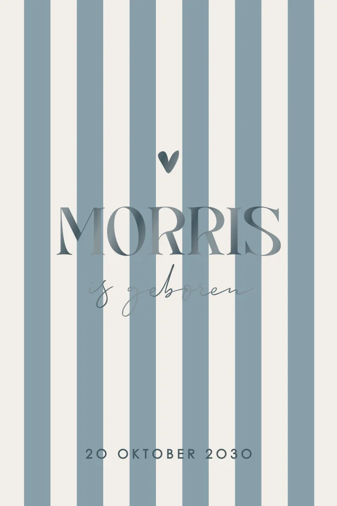 Prachtig geboortekaartje om de geboorte van jullie zoon aan te kondigen! De kaart heeft een mooie gestreepte blauwe achtergond en de naam wordt in hoogglans gedrukt. Pas de kaart eenvoudig aan in onze editor.Dit product maakt onderdeel uit van deze set.
