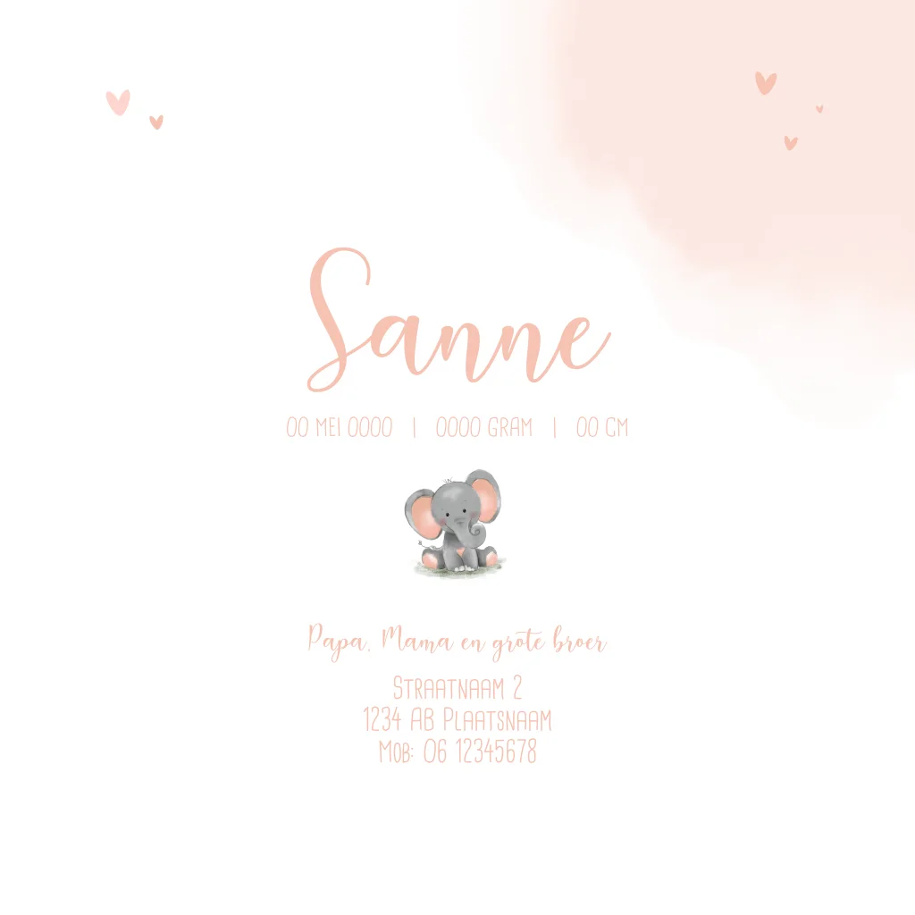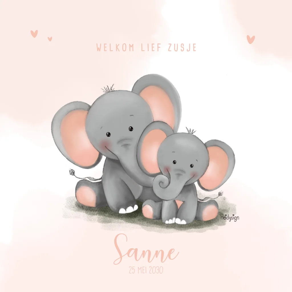 Schattig geboortekaartje met olifanten, perfect om te personaliseren in onze online editor.Plaats zelf de teksten en elementen eenvoudig op de juiste plek in onze opmaaktool. Heb je hier hulp bij nodig? Neem gerust even contact met ons op!