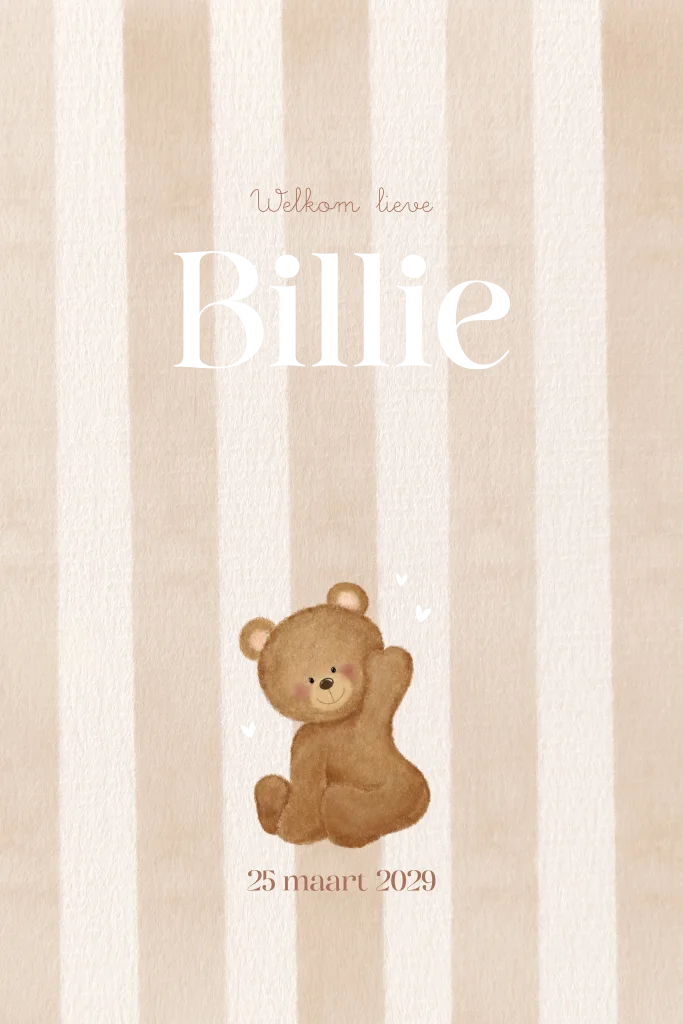 Schattig geboortekaartje met beer en strepen, personaliseer eenvoudig met onze editor.Plaats zelf de teksten en elementen eenvoudig op de juiste plek in onze opmaaktool. Heb je hier hulp bij nodig? Neem gerust even contact met ons op!