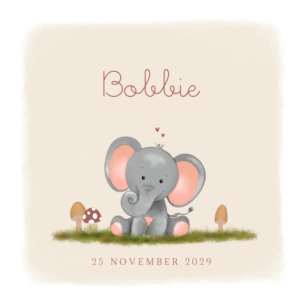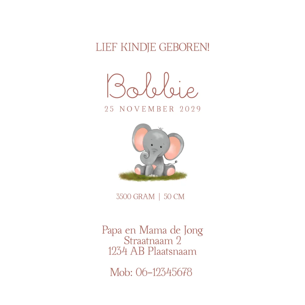 Lief geboortekaartje met olifant illustratie. Pas het ontwerp naar wens aan in onze online editor.Plaats zelf de teksten en elementen eenvoudig op de juiste plek in onze opmaaktool. Heb je hier hulp bij nodig? Neem gerust even contact met ons op!
