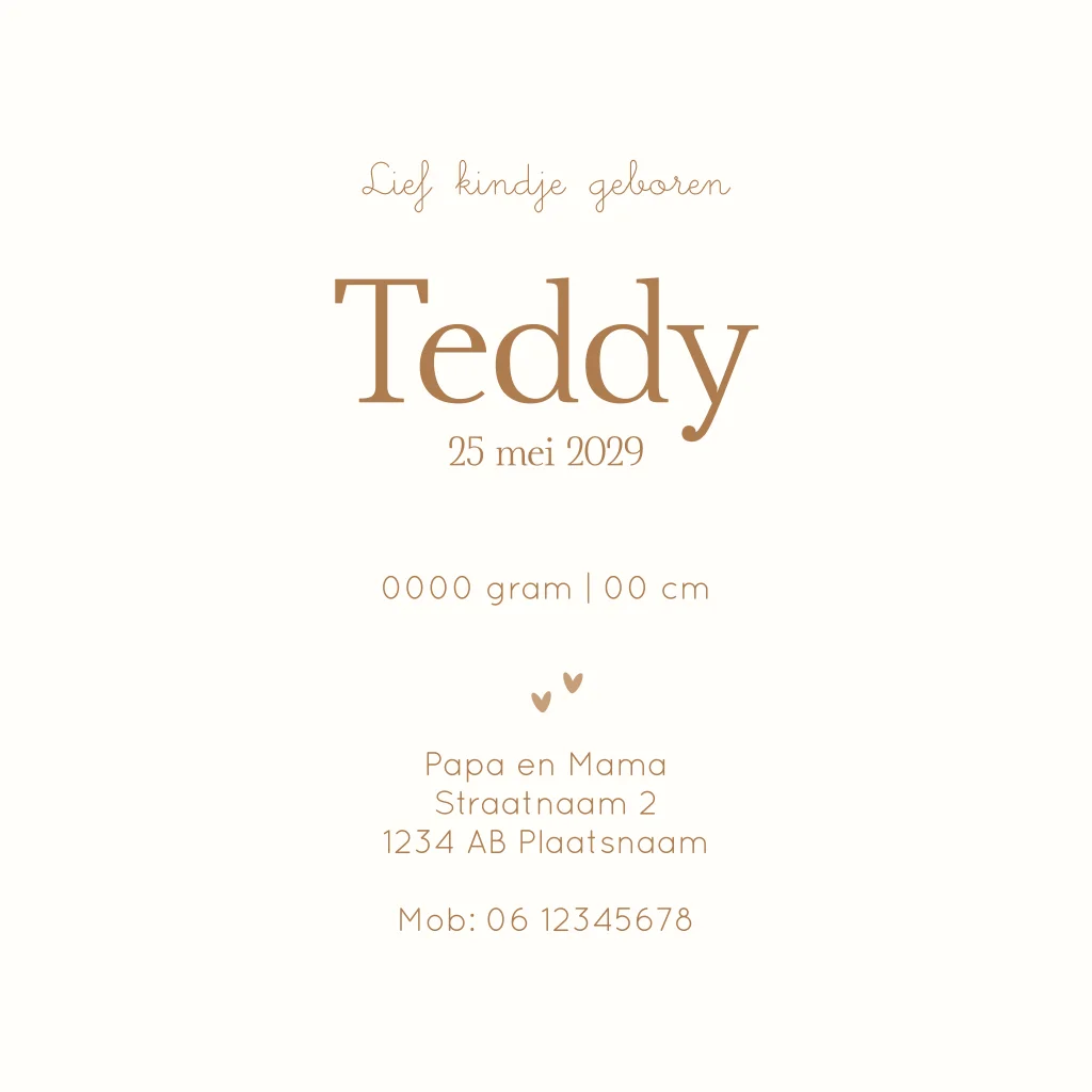 Een lief geboortekaartje met beer illustratie. Pas het ontwerp naar wens aan in onze online editor.Plaats zelf de teksten en elementen eenvoudig op de juiste plek in onze opmaaktool. Heb je hier hulp bij nodig? Neem gerust even contact met ons op!