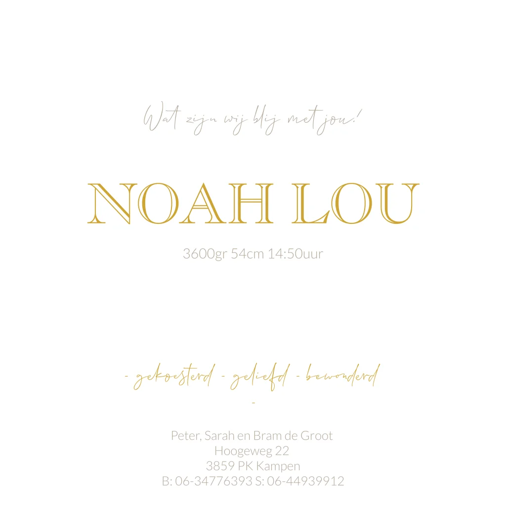 Dit is een prachtig kaartje voor jullie pasgeboren zoon of dochter. Het kaartje heeft een beige marmer-look achtergrond waartegen de goudfolie naam van jullie kleintje mooi naar voren komt. Pas het kaartje naar wens aan in onze online editor!