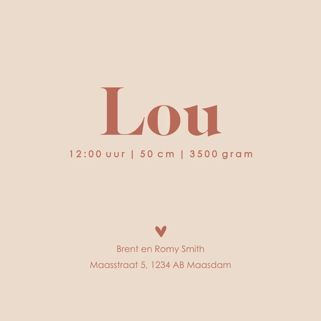 De kaart heeft een koperkleurige achtergrond en is bedruk met goudfolie. Het goudfolie geeft de kaart een extra luxe uitstraling. Pas het kaartje naar wens aan in onze online editor en bestel een proefdrukje om dit kaartje in het echt te zien!