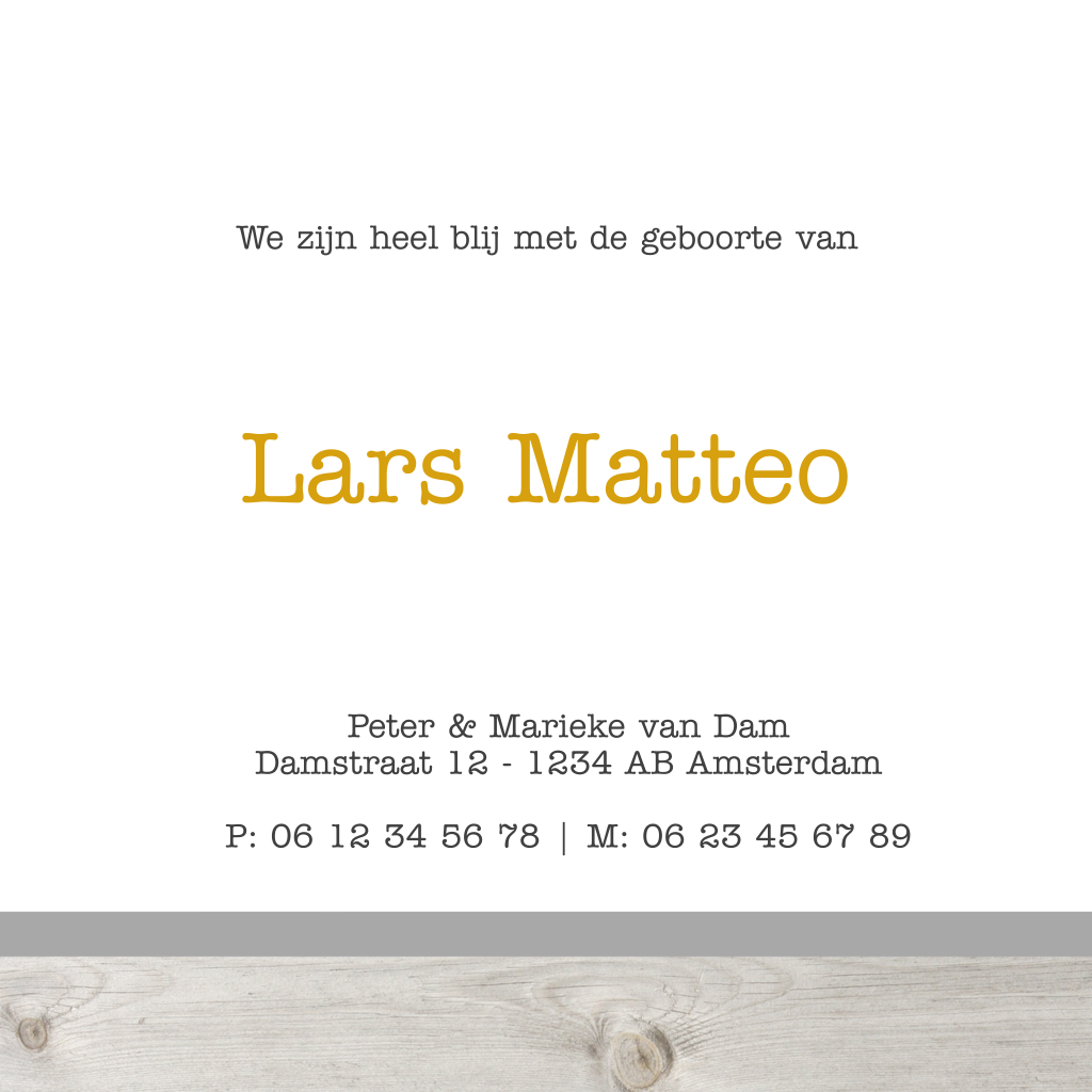 Een stoer geboortekaartje voor een zoontje dat is gepimpt met hout, sterren en een trendy label. Uniek is dat de naam wordt gedrukt in echt goudfolie! Hoe heet jouw kleine jochie?