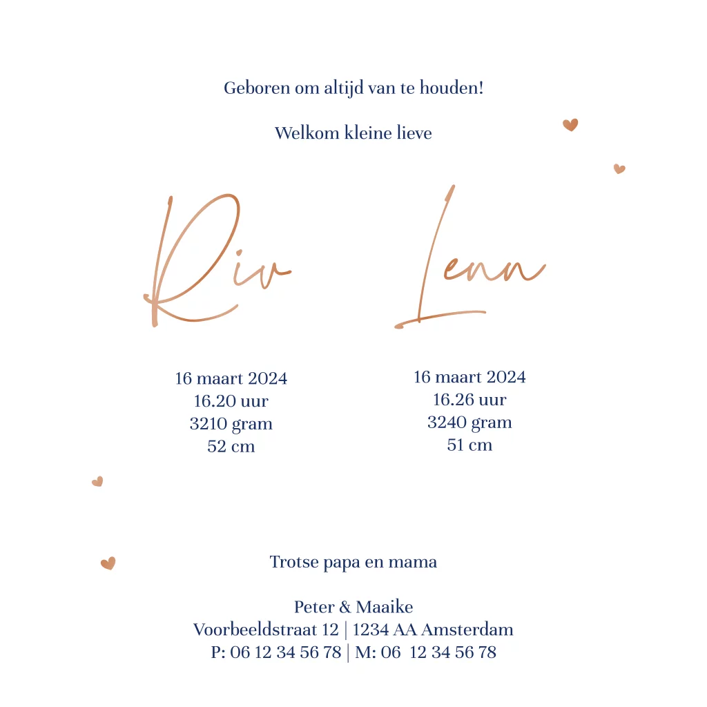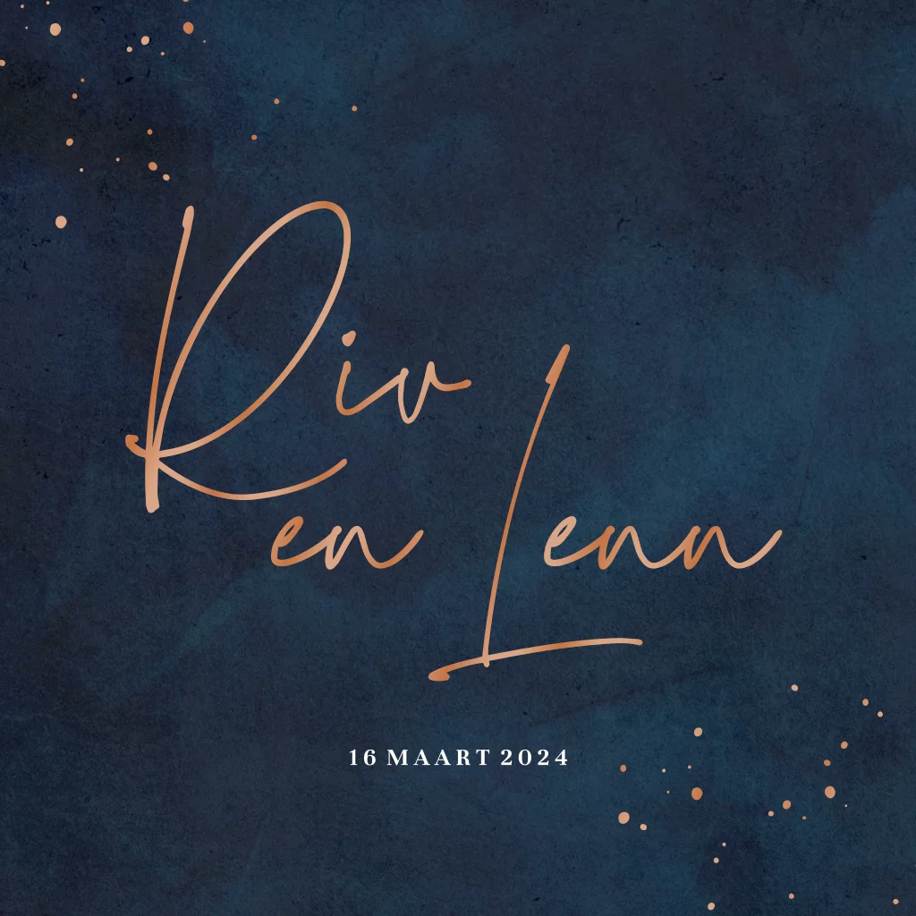 Stoer geboortekaartje voor een jongens tweeling met hoogglans namen. De achtergrond bestaat uit een mooie blauwe velvet-look. Maak het kaartje helemaal eigen in onze online editor.
