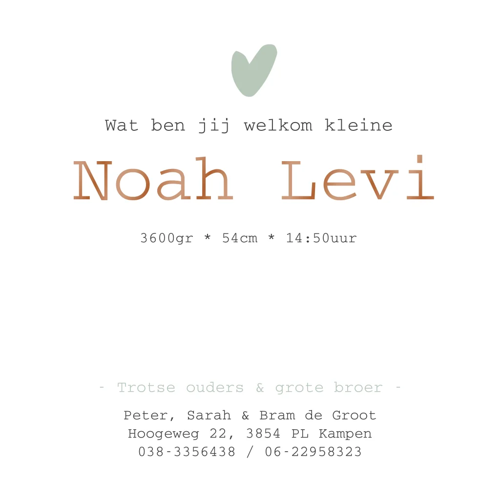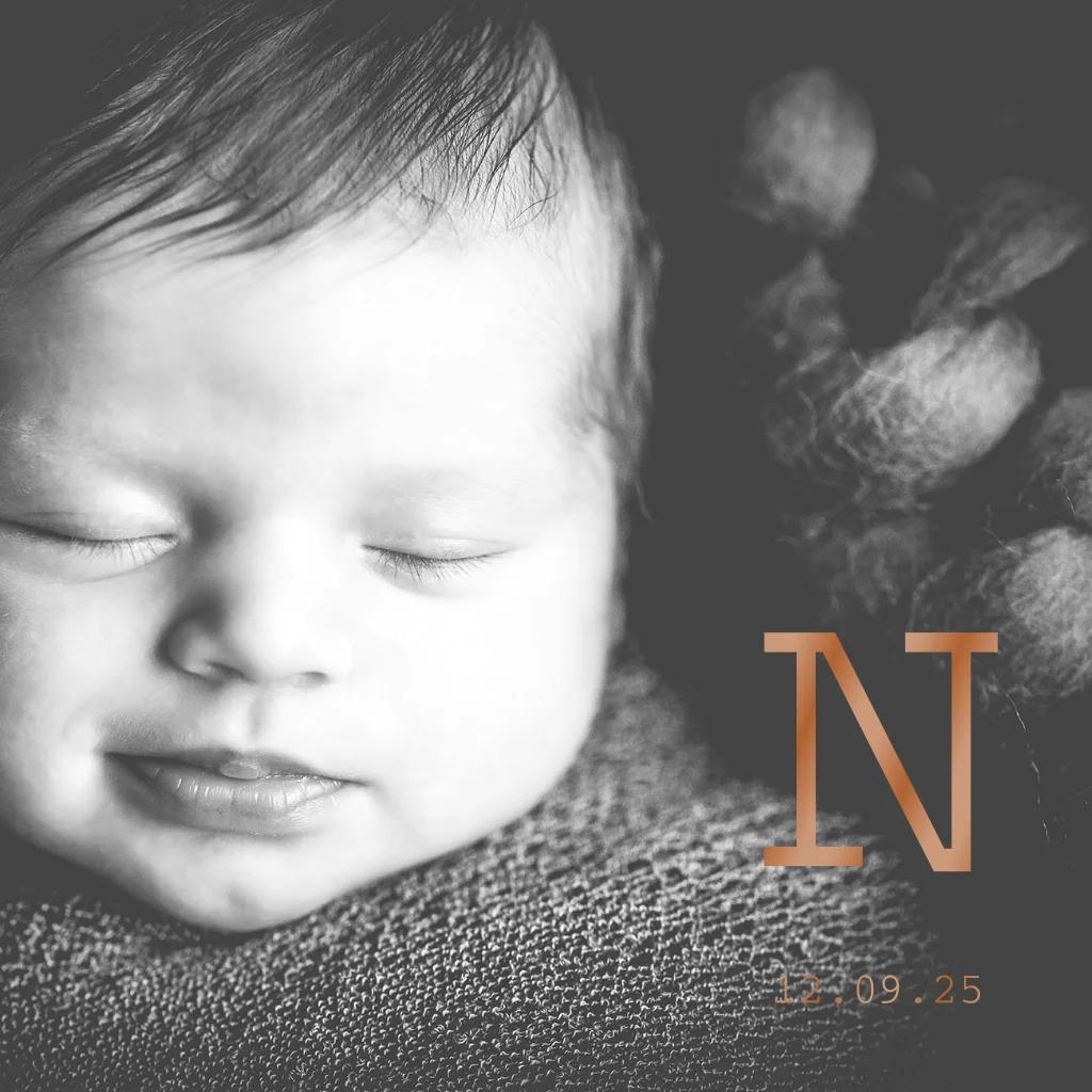 Stoer geboortekaartje met foto. De letter en datum op de voorkant zijn in hoogglans. Wist je dat de naam op de binnenzijde en achterzijde ook in hoogglans is? Pas dit makkelijk aan door op de letter te klikken en de kleur aan te passen naar de gewenste kleur.