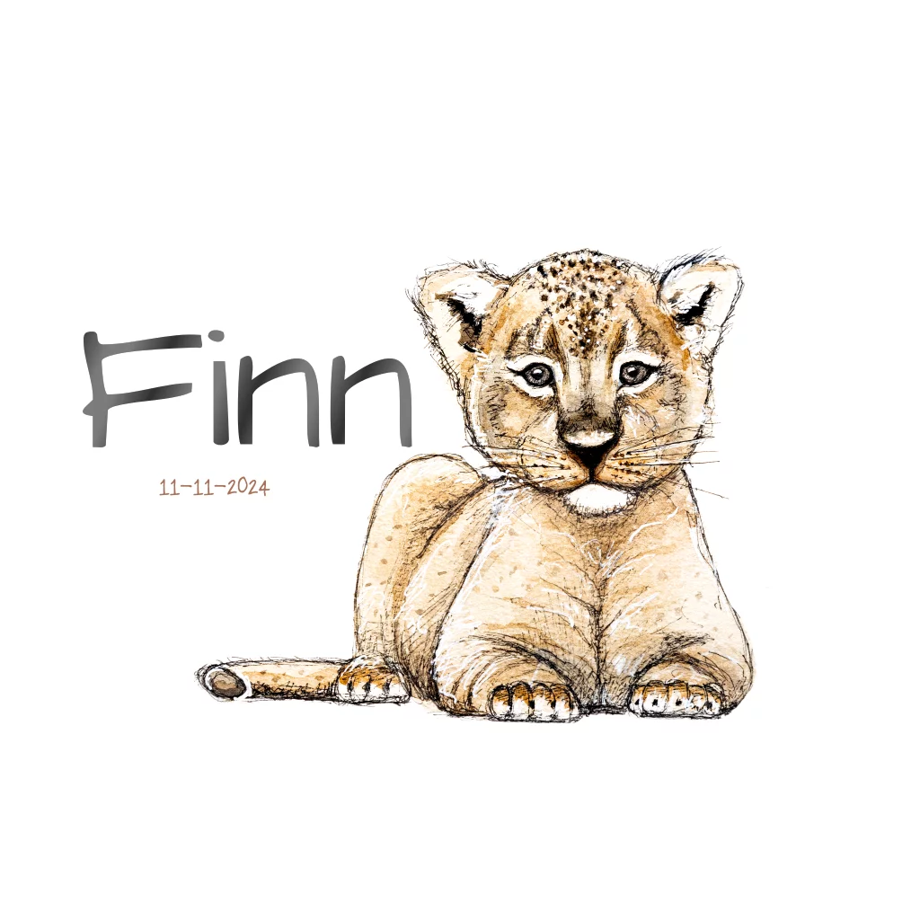 Het baby leeuwtje op deze kaart is met de hand getekend en daarna met aquarel geschilderd. De naam van jullie zoontje wordt gedrukt in zwart folie. Het kaartje is helemaal naar wens aan te passen in de online editor!
