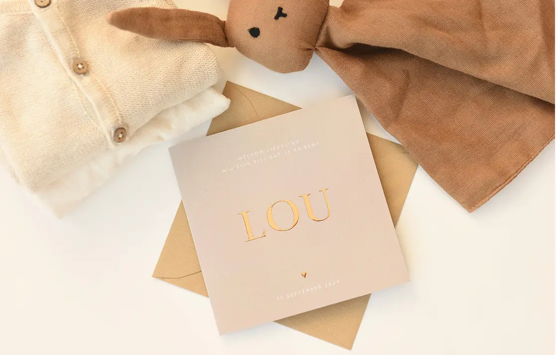 Wat een stoer babykaartje voor de geboorte van jullie zoontje! De achtergrond van het kaartje is in leerlook. In combinatie met de naam van jullie zoon in goudfolie is dit kaartje super hip.