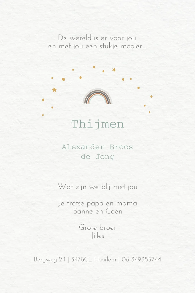Wat een trendy babykaartje voor een jongen! Uniek aan dit hippe geboortekaartje met regenboog zijn de stippen en sterren van goudfolie. Dit geeft jouw kaartje een speciaal effect!
