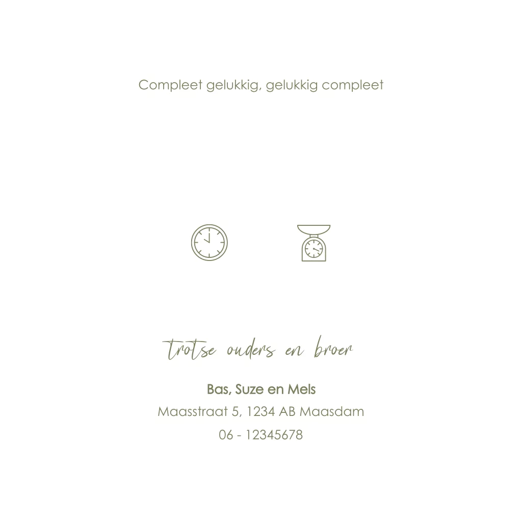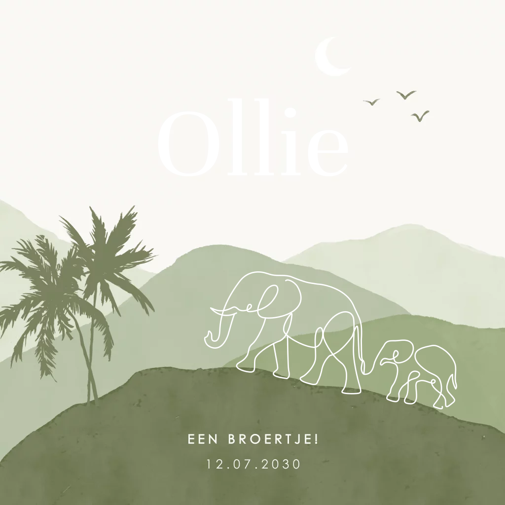 Dit is een avontuurlijk kaartje voor jullie pasgeboren zoon en broertje. Op het kaartje is een abstract landschap in groentinten te zien. De lijntekeningen van de olifanten en de naam worden gedrukt in goudfolie. Pas het kaartje naar wens aan in onze online editor en bestel snel een proefdruk om dit kaartje in het echt te zien!