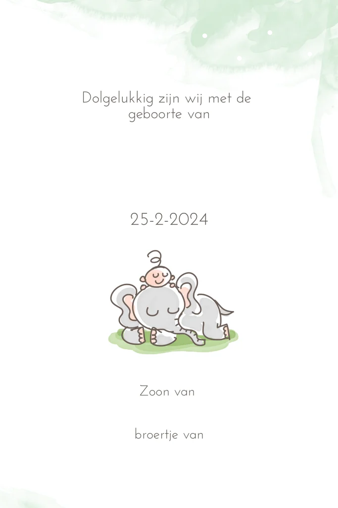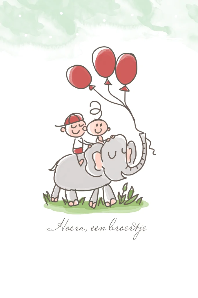 Dit is een bijzonder kaartje om de geboorte van jullie tweede kindje mee aan te kondigen. Bovenop de rug van dit olifantje zitten een grote broer en zijn pasgeboren broertje. De rode ballonnen, mintgroene watercolour en goudfolie details maken dit kaartje extra feestelijk.